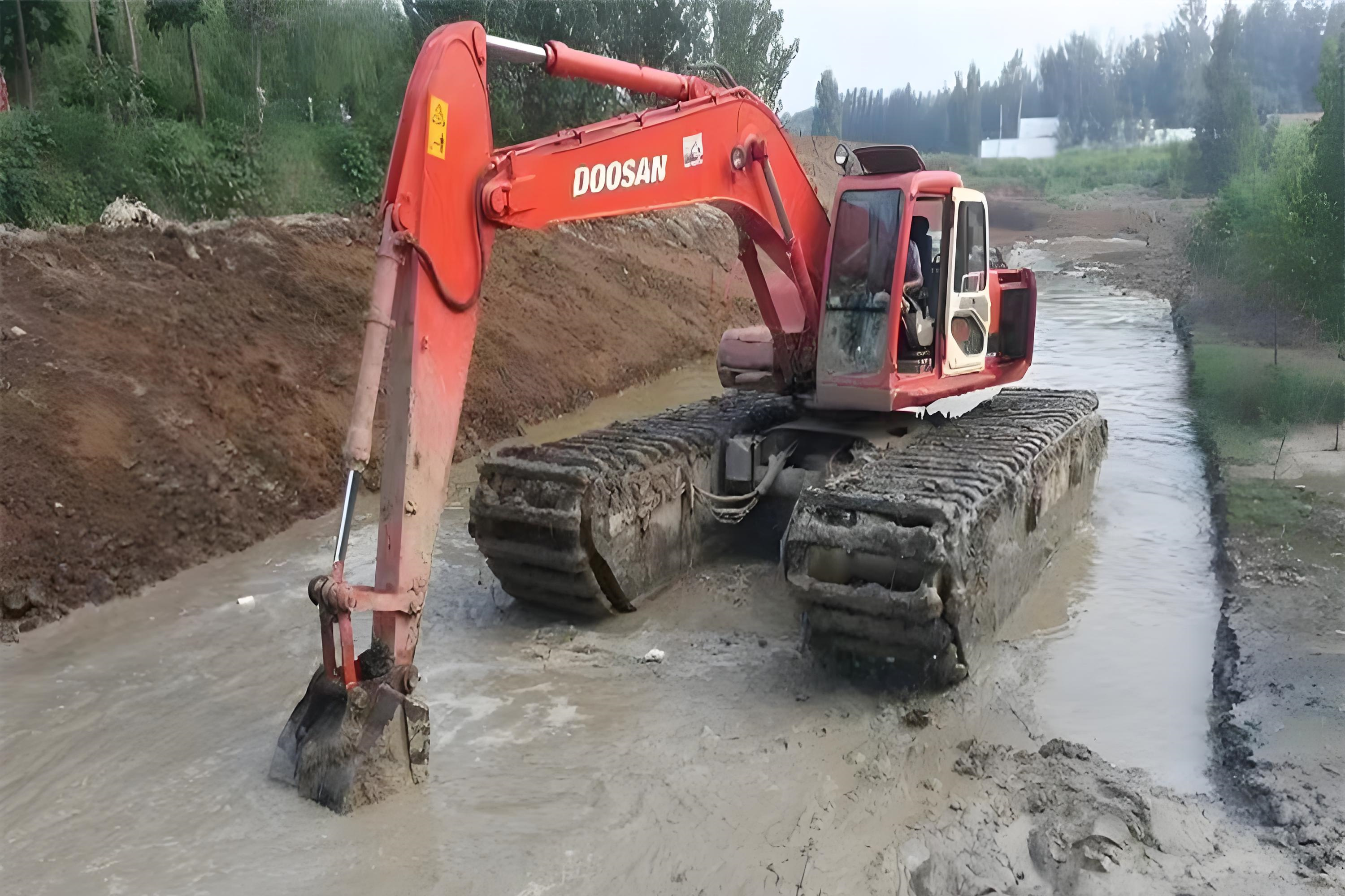 1. 水陸兩用挖機(jī):黃河灘區(qū)的 “萬能選手”河南沿黃地區(qū)的淤泥有個(gè)特點(diǎn) —— 上層是 30-50 厘米的浮泥,底下藏著流沙層,普通挖機(jī)一踩就陷。泓樺錦嘉用的 8 噸級(jí)水陸挖機(jī),履帶比普通挖機(jī)寬 30 厘米(像穿了 “大腳掌”),接地壓強(qiáng)能降到 0.12 兆帕,在開封柳園口黃河灘清淤時(shí),陷車次數(shù)比用普通挖機(jī)減少了 70%。這類挖機(jī)最適合水深 1 米以內(nèi)的淺灘、沼澤地。